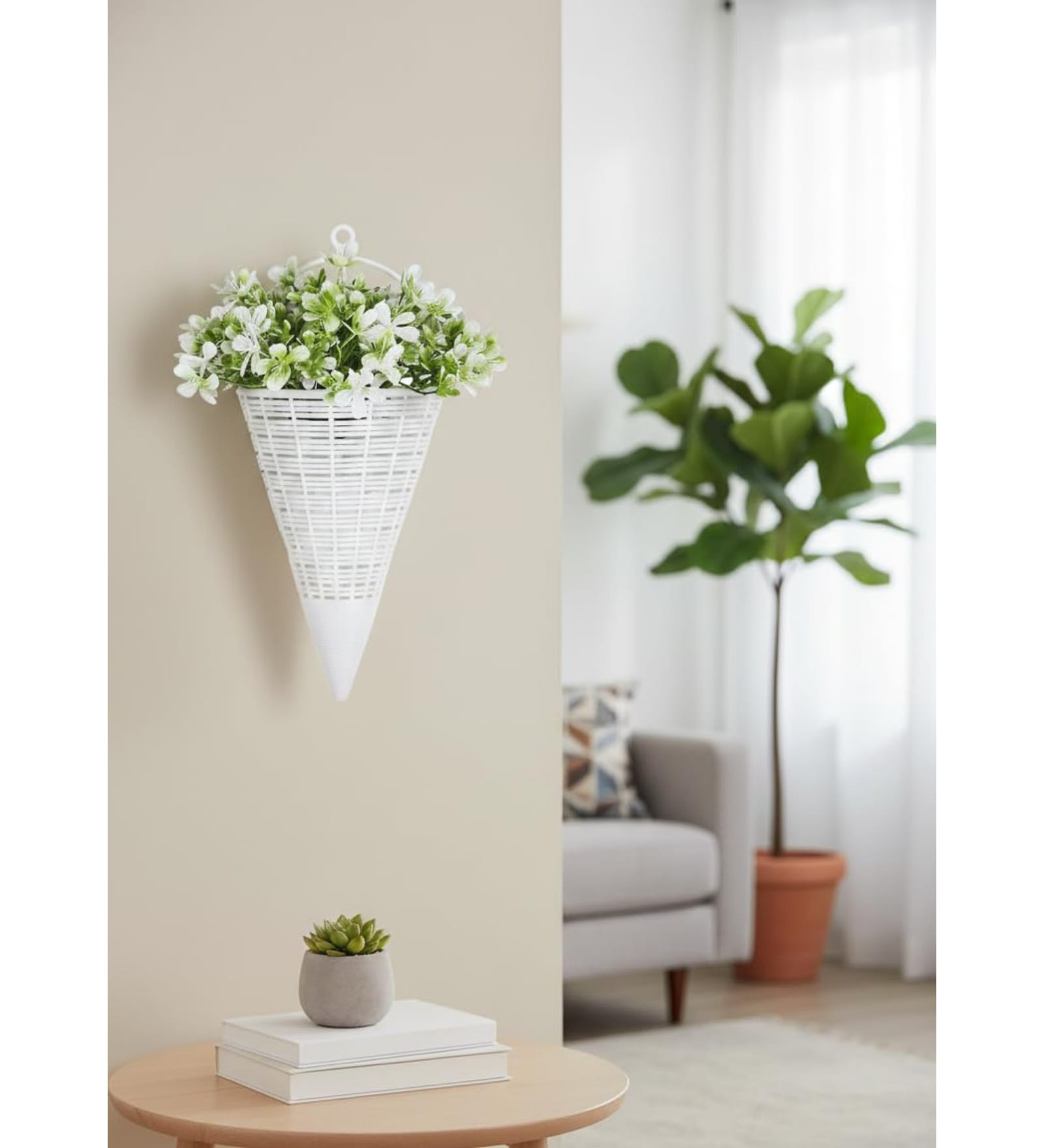 Foliyaj Artificial Wall Plant with Small White Flowers – 1 pc | Artificial wall planters for Decoration | Plastic & Polyester Blend Artificial Plant with Pot (32 cm Length)